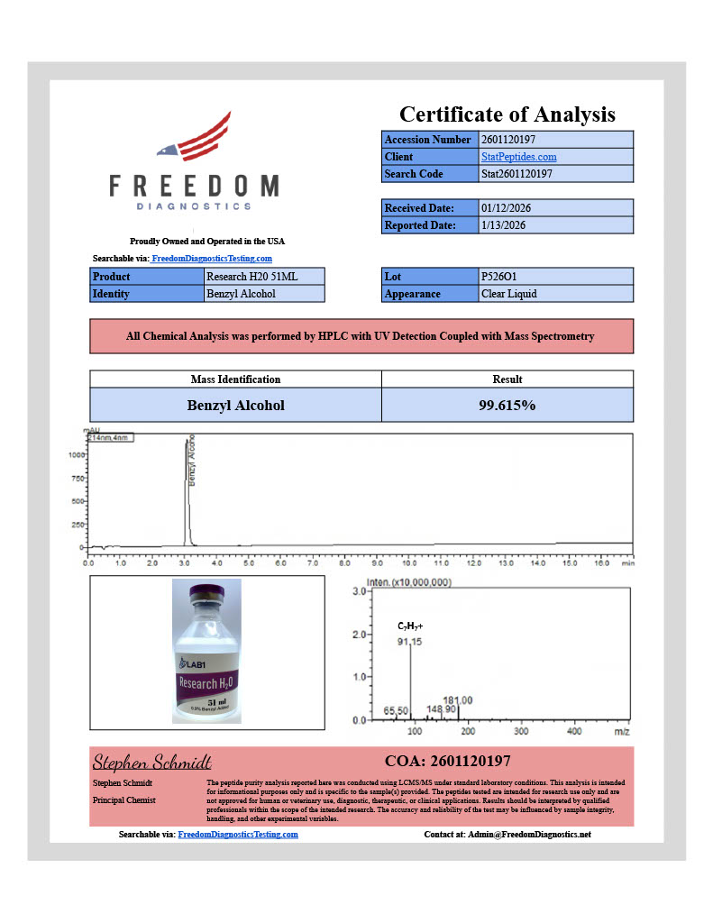 Lab1 Research H2O with 0.9% Benzyl Alcohol is premium-grade water, prepared in a controlled environment. Engineered for the most demanding laboratory applications, our proprietary crafting process delivers consistent, high-purity performance for critical research.